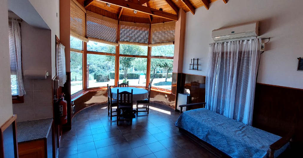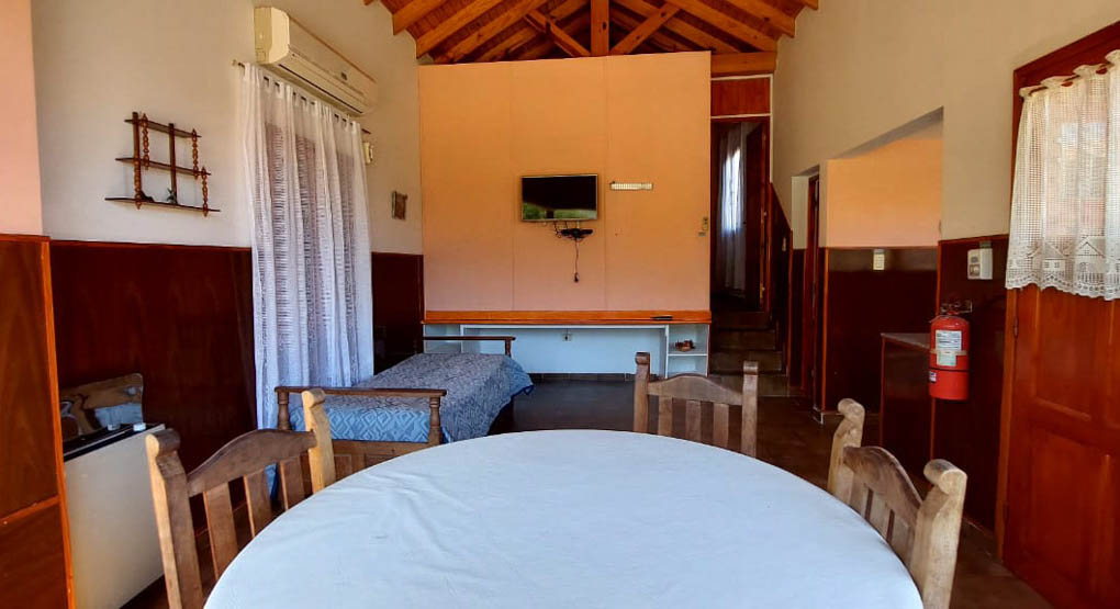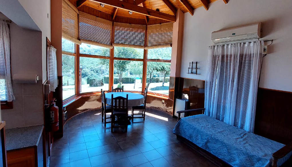 Una superficie total de 50 m² propios . Consta de un estar comedor con un ventanal tipo bow-window con excelentes vistas a las sierras, donde se encuentran un sofá cama (y otra bajo carrito), una cocina totalmente equipada (heladera sin freezer, microondas), un dormitorio principal, un baño completo con bañera y una cochera propia semi cubierta con opción a ser utilizada como quincho. Parrilla propia. Equipada para 4 personas. Aire acondicionado frío-calor en living-comedor.
