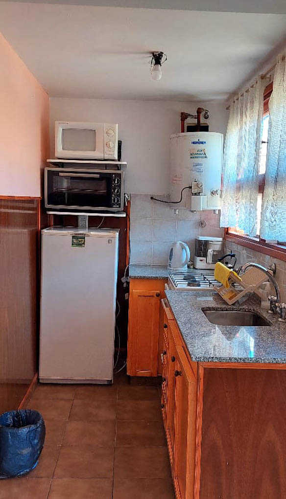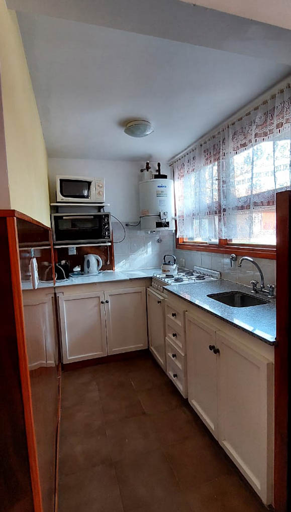 Consta de un estar comedor con ventana tipo bow-window con excelentes vistas a las sierras donde posee un sofá-cama (carrito-cama abajo), una cocina totalmente equipada, un dormitorio principal matrimonial con placard, un segundo dormitorio con dos camas de una plaza, un baño completo con bañera y una cochera semicubierta con techo de tejas, con parrilla individual. Aire acondicionado frío-calor y ventilador de techo en living-comedor. Ventilador de techo en habitaciones.