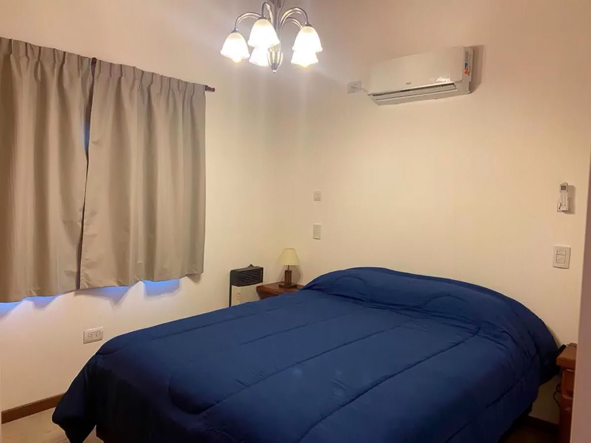 Dormitorio principal en planta baja con sommier matrimonial con aire acondicionado frío calor y estufa tiro balanceado.